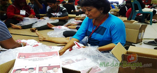 Seorang pekerja menghitung jumlah surat suara pemilu presiden (pilpres) 2014 yang telah selesai disortir dan dilipat di Gedung eks Bandara Polonia, Medan, Selasa 925/6/2014). Sebanyak 216 pekerja dikerahkan oleh KPU Medan untuk melakukan proses sortir dan pelipatan surat suara tersebut. Para pekerja menerima upah sebesar Rp 75 per lembar surat suara yang telah selesai disortir dan dilipat.[Foto: Robedo Gusti]