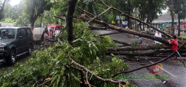Hujan deras disertai angin kencang yang mengguyur Kota Medan, menyebabkan pohon tumbang di kawasan Jl DR Mansyur, Medan, Rabu (2/7/2014). Batang pohon tersebut melintang pada salah satu ruas jalan ini menyebabkan kendaraan tidak dapat melintas. Akibatnya, arus lalu lintas pada salah satu jalan tersibuk di Kota Medan tersebut mengalami gangguan dan terpaksa dialihkan ke ruas jalan lainnya. Selain mengganggu aktifitas lalu lintas, pohon tumbang juga membahayakan bagi pengguna jalan.[Foto: Robedo Gusti]