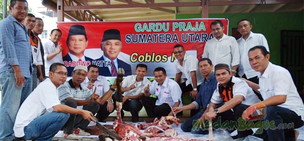 Relawan Gerakan Rakyat Dukung Prabowo-Hatta Rajasa (Gardu Praja) Sumut bersama beberapa organisasi lainnya di Medan, membagikan daging punggahan dalam rangka menyambut datangnya bulan suci Ramadhan 1435 H/2014 M. Kegiatan yang dilaksanakan di kediaman pembina Gardu Praja, H. Idrus Djunaidi, di Jalan Brigjend Zein Hamid, Gang Melur, Kampung Baru, Medan, Jumat (27/6/2014). Kegiatan sosial ini juga berkaitan dengan sosialisasi pemenangan pasangan pasangan capres/cawapres nomor urut 1, Prabowo-Hatta.[Foto: Rizki Palepi]