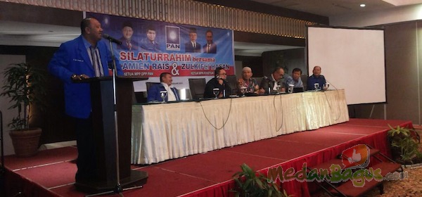Ketua DPW Partai Amanat Nasional (PAN) Syah Afandin memberikan sambutan dalam silaturahmi antara calon ketua umum PAN Zulkifli Hasan dengan kader partai itu di Kota Medan (Minggu, 18/1). Pertemuan yang digelar di Hotel Emerald Medan itu juga dihadiri pendiri PAN, Amien Rais.
