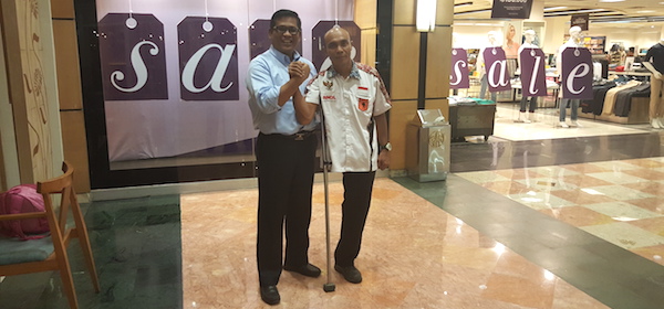 Tokoh muda Medan, Abdullah Rasyid, berfoto bersama dengan pendaki tunadaksa Sabar Gorky dalam pertemuan di Jakarta, Senin malam (8/6). Anak-anak Medan, pesan Abdullah Rasyid, perlu meneladani semangat Sabar Gorky. Walaupun hanya memiliki satu kaki, Sabar tidak putus asa dan telah mendaki dua puncak tertinggi di dunia, yakni Gunung Elbrus dan Gunung Kilimanjaro. Sabar juga merupakan juara satu panjat dinding tingkat Asia (2009) dan juara empat panjat dinding tingkat dunia (2012).