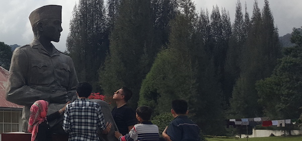 Sejumlah wisatawan lokal memperhatikan patung Bung Karno di depan rumah yang pernah menjadi tempat pengasingan Bung Karno pada Desember 1948 di Berastagi, Tanah Karo Sumatera (20/7). Patung setinggi 7 meter yang diresmikan pada 2005. Rumah pengasingan Bung Karno merupakan salah satu tujuan wisata di Berastagi, dan ramai dikunjungi pada hari-hari libur besar seperti Hari Raya Idul Fitri.