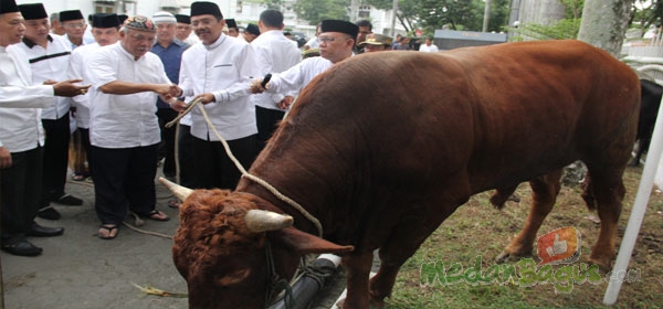 Menteri PU dan Perumahan Rakyat Basuki Hadimuljono menyerahkan secara simbolik sapi raksasa bantuan kurban Presiden Jokowi kepada Plt Gubernur Sumut Tengku Erry Nuradi disaksikan Sekda Hasban Ritonga dan Kepala Biro Binsos selaku Ketua Panitia Kurban H M Yusuf dan Sekretaris Sudarto Purba di pelataran parkir Kantor Gubernur Sumut Jl Diponegoro Medan, Kamis (24/9/2015).