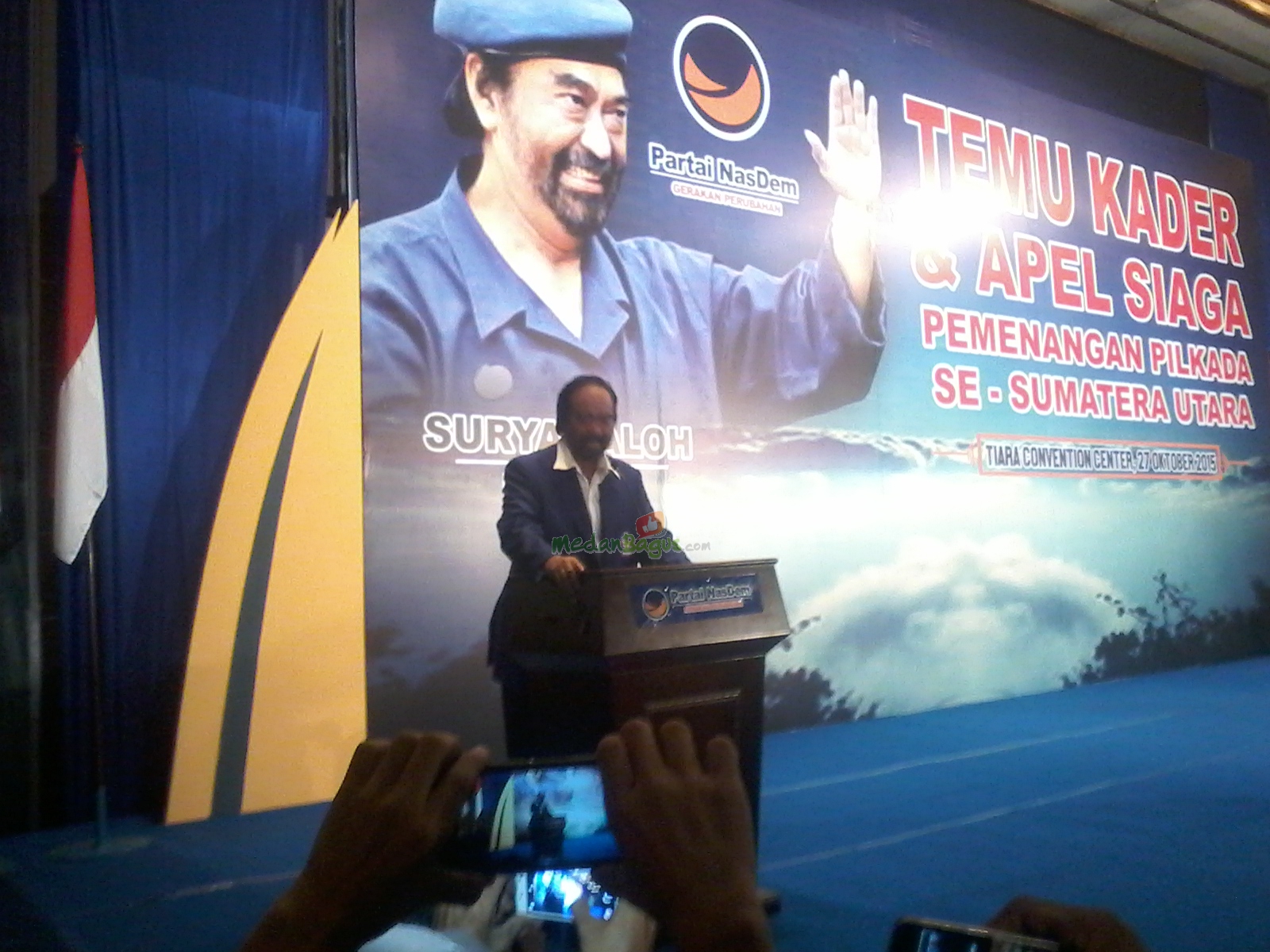 Paloh hadir di Medan memberikan pengarahan dalam rangka pemenangan Pilkada serentak yang digelar pada 23 kabipaten/kota di Sumut. Seluruh pasangan calon yang diusu g oleh Nasdem hadir dalam pertemuan tersebut.[rgu]