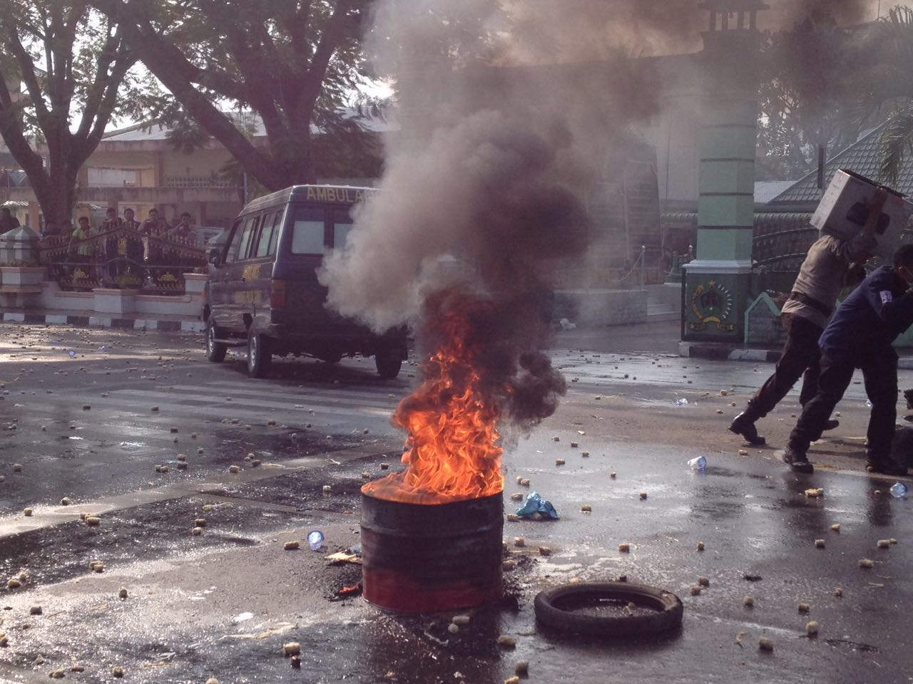 Sementara api yang berasal dari ban bekas yang terbakar terus membesar. Demikian pula dengan butir batu yang tak henti-hentinya berterbangan menghantam aspal jalan yang sudah basah karena tersiram air dari mobil pemadam kebakaran yang diturunkan khusus untuk menghalau pengunjuk rasa. Sejumlah fasilitas umum pun telah porak-poranda.
