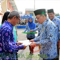 Usai apel Walikota HM Idaham didampingi Kepala Kantor Pertanahan Kota Binjai R Sinamo menyerahkan secara simbolis sertifikat hak milik kepada peserta prona tahun 2016.[rgu]