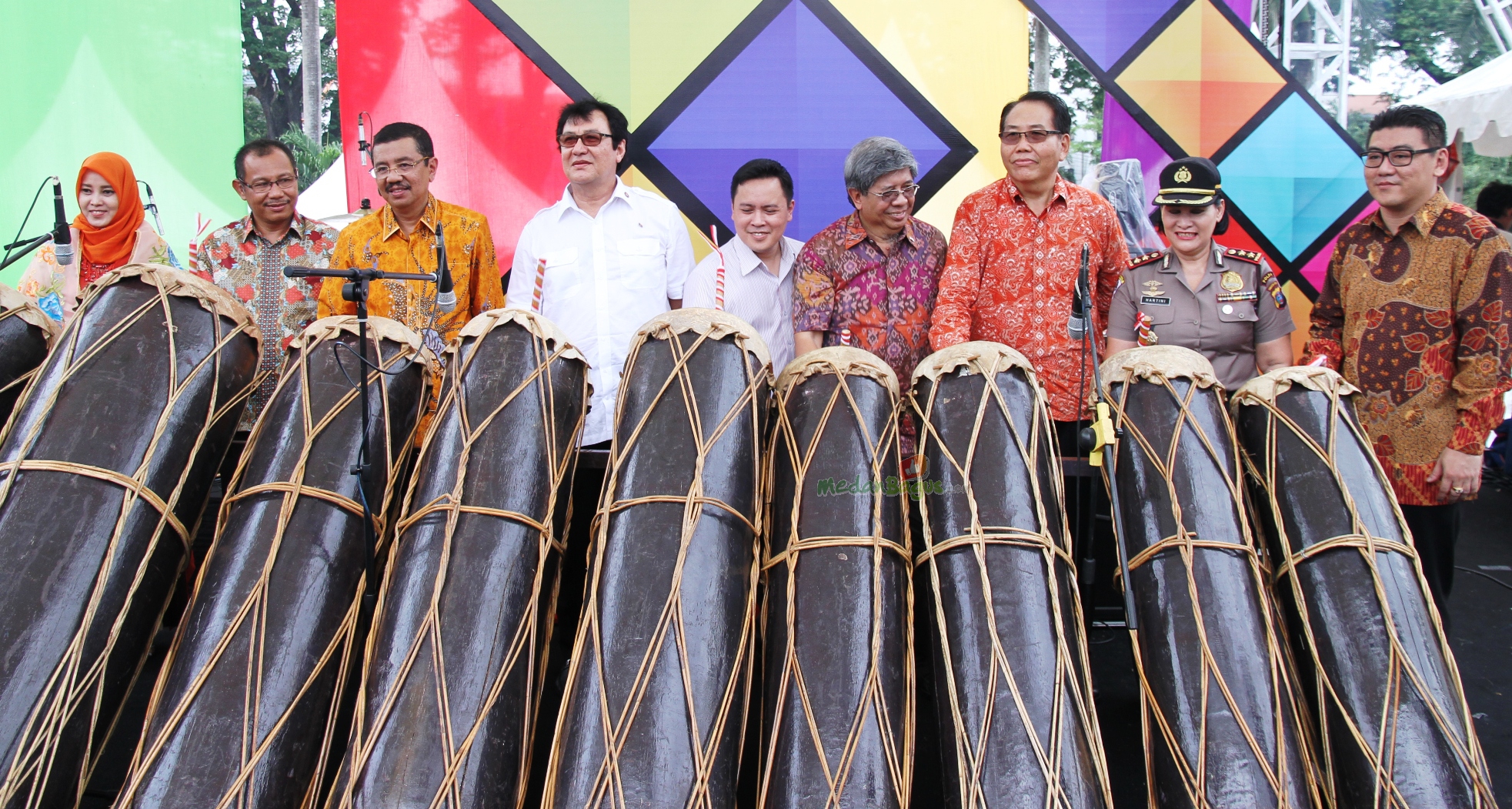 Plt Gubernur Sumut Tengku Erry Nuradi, Wakil Walikota Medan, Ketua Penyelnggara, perwakilan Kemenperindag dan pelaku usaha memukul Gordang Sambilan menandai pembukaan kegiatan Sumatera International Expo (Sumex) 2016 di Lapangan Merdeka Medan, Kamis (5/5).