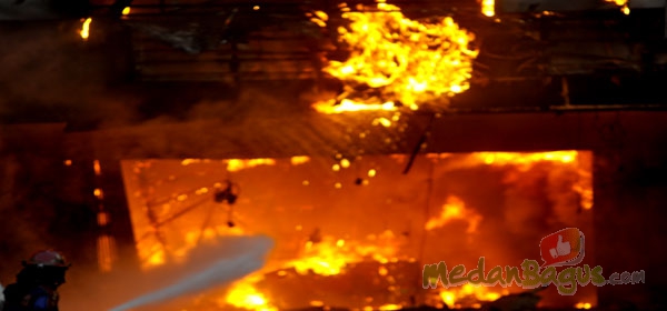 KOMENTAR Kobaran api melahap habis Pasar Aksara dan Ramayana, Selasa (12/7). Hingga malam hari, pemadam kebakaran terus berupaya memadamkan api. [Foto: Fajar Siddik]