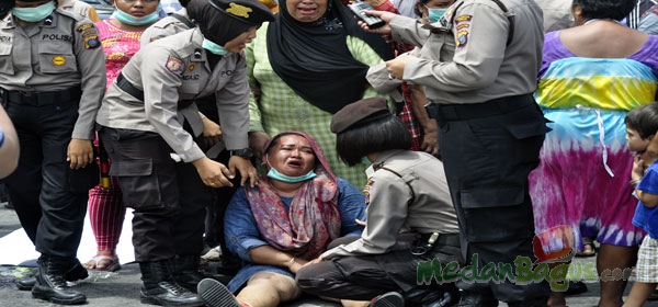 Para pedagang Pasar Aksara yang melakukan aksi unjuk rasa tepat di simpang aksara enggan ditertibkan oleh petugas kepolisian, Kamis (28/7). Para pedagang mengaku, hingga 15 hari pasca kebakaran Pasar Aksara, mereka tidak dapat mencari rezeki.