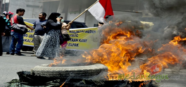 Pedagang Pasar Aksara kembali melakukan unjuk rasa dan aksi bakar ban, Rabu (3/8). Aksi tersebut merupakan kali kedua setelah pada pekan lalu para pedagang juga melakukan hal serupa. Para pedagang menuntut Walikota Medan untuk segera memenuhi janjinya membangun tempat relokasi.