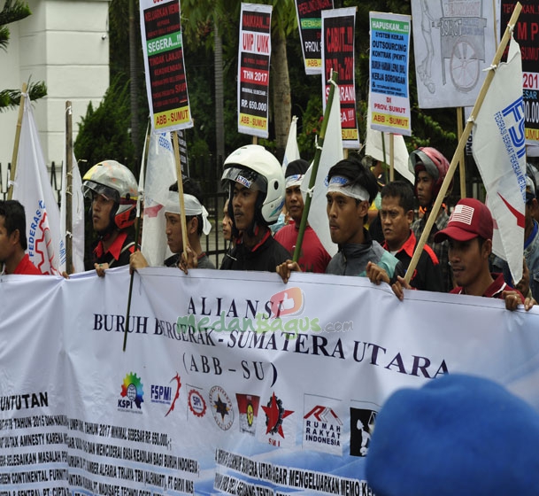 "Ada banyak persoalan buruh yang belum dapat diselesaikan oleh Pemprovsu. PT. Sumber Alfaria Trijaya Tbk Tanjung Morawa melakukan pemotongan upah hingga jutaan rupiah dengan modus NBH, Ketua Serikat PUK FSPMI PT. Girvi Mas di PHK karena memperjuangkan hak anggotanya yang belum mendapat jaminan sosial, puluhan buruh PT. Green Continental Furniture Patumbak belum mendapat pesangon karena perusahaan tutup dan pengusahanya yang orang Malaysa kabur," kata Koordinator Aksi, Willy Agus Utomo saat berorasi.