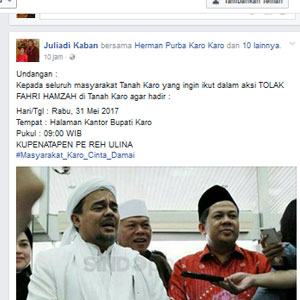 Hari/Tgl : Rabu, 31 Mei 2017, Tempat : Halaman Kantor Bupati Karo Pukul : 09:00 WIB, KUPENATAPEN PE REH ULINA," begitu diposting pemilik akun Juliadi Kaban.